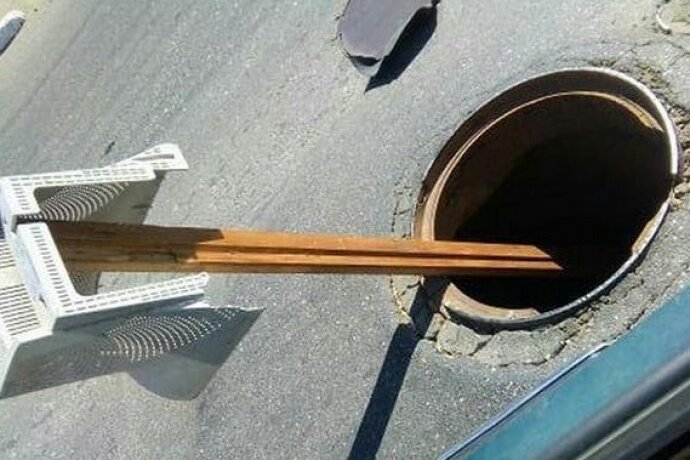 Самодельный знак — пластиковый корпус от бытовой техники, повешанный на деревянную палку, поместили в открытый люк на проезжей части на улице Кирова в Астрахани. Фотография креативного предупреждения появилась сегодня в одной из социальных сетей. Вопрос «Куда же делась крышка люка?» остался без ответа.