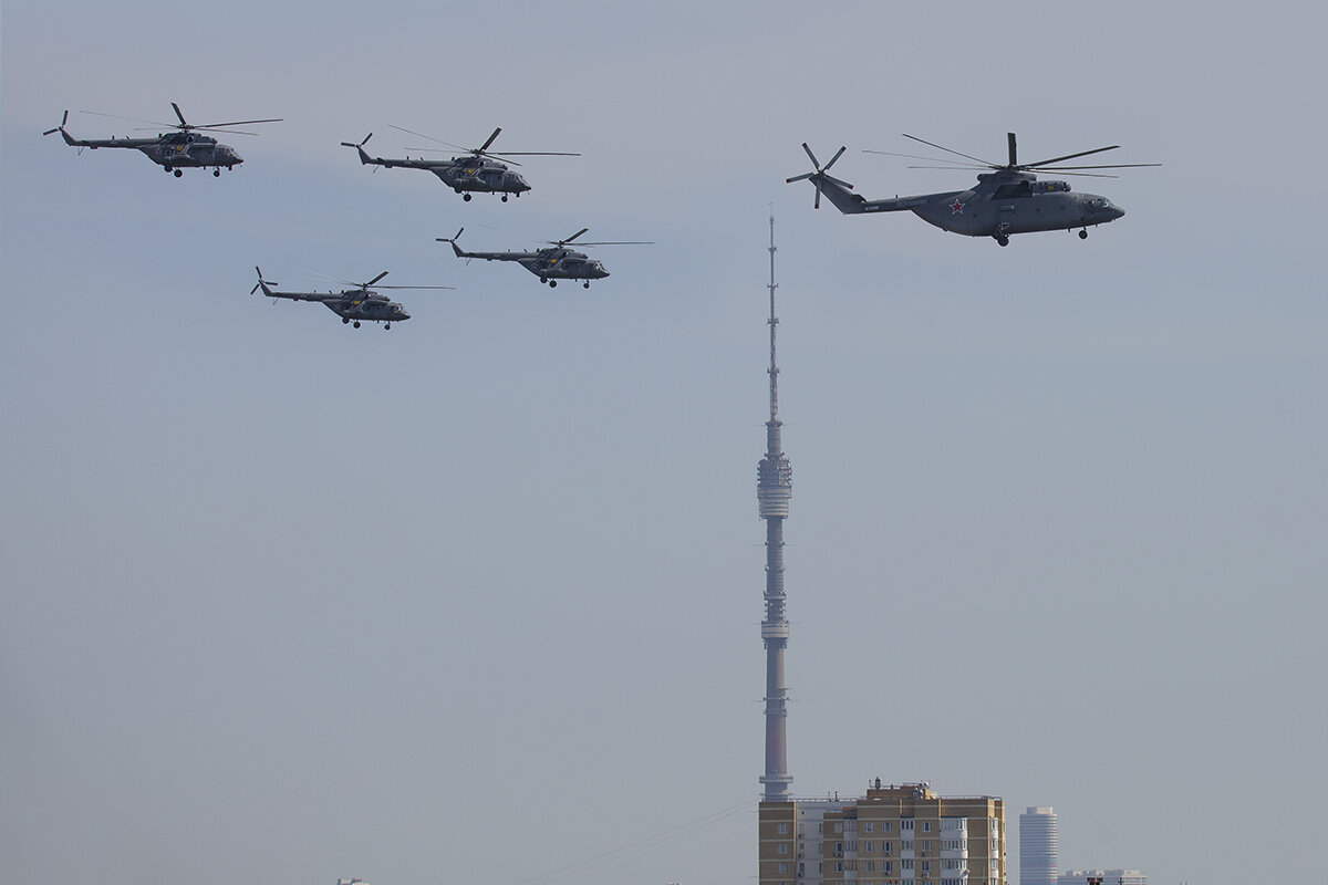 В этом году проход (наверное по другой схеме заход был) вертолетов был дальше и поворачивали они на прямую в районе белорусской. Дымы тоже включили поздно, так что их в утреннем мареве было с моей точки просто бессмысленно.