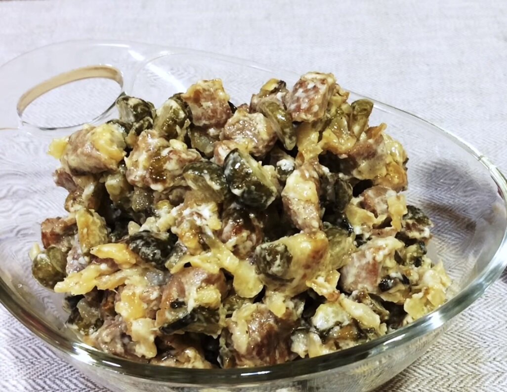 САЛАТ ИЗ МЯСА И СОЛЕНЫХ ОГУРЦОВ И ЛУКА Предлагаю Вам рецепт салата из мяса с добавлением соленых огурцов и жаренного лука, который точно удивит Ваших гостей. Что самое важное, для этого салата Вам понадобится минимум продуктов, которые наверняка найдутся в холодильнике у каждого. Блюдо получается очень дешевым, а главное очень вкусным. Чтобы Вам было проще его приготовить, я предлагаю Вам пошаговый рецепт с фотографиями и описанием. Салат очень популярен в России, как закуска при застолье. Его необычный вкус очень понравится Вашим гостям. Салат с добавлением мяса и жаренного лука готовится очень быстро. Он прекрасно гармонирует с другими блюдами. Приготовить его очень легко и быстро. Итак, Вам понадобится: Обжарим свежее мясо для салата Мясо для салата нарезаем кубиками небольшого размера и обжариваем. Лучше всего взять свинину, но можно брать и другое, какое найдете у себя дома. Солить мясо не надо, так как мы добавим соль уже в готовый салат. Жарить мясо нужно не долго, так как ку