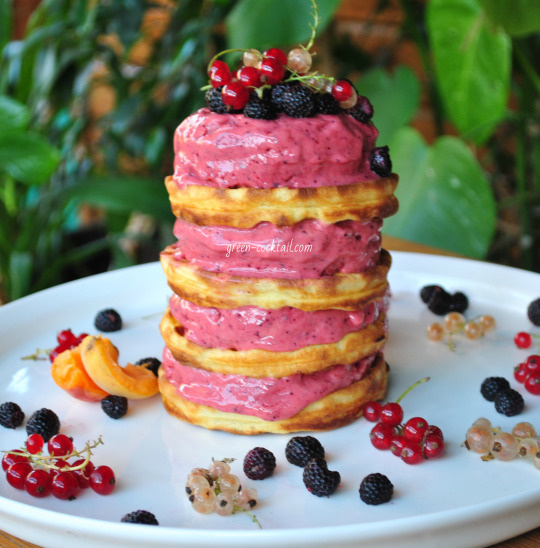 клубника - 100 гр.; ежевика - 100 гр.; красная смородина - 100 гр.; малина - 100гр.; абрикосы или бананы - 0. 6 кг.; ореховое молоко или любая жидкость( сливки, вода, йогурт) - 3 ст. л.; Стевия - 10 капель или любой подсластитель: мед, сироп, сахар - 2 ст. л.; вафли - 4 шт. Способ приготовление: