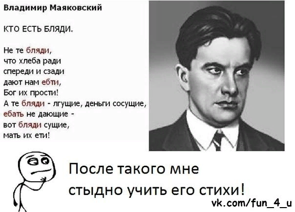 Здесь любой изгиб - его заслуга... ♦♦♦ Хорошо быть кисою, Хорошо - собакою. Где хочу пописаю, Где хочу покакаю. Вырыл ямку лапкою, Положил какашку, И не надо попку Вытирать бумажкой... ♦Если кто тебя обидел — ты не дуйся, не сердись. Подойди, по роже тресни, отойди и улыбнись! ♦♦♦Уронили мишку на пол, Оторвали мишке лапу, В попу мишке вставлен веник , Мишка должен много денег... ♦♦♦Иду мимо кладбища, Молча курю, На холмик могильный с опаской гляжу.. Вдруг, голос из гроба: "Тебя проводить?" Вот так очень быстро я бросил курить... ♦♦♦Свет мой, зеркальце, скажи, Да всю правду доложи! Я ль на свете всех тупее, Бесполезней и пьянее? Молвит зеркальце в ответ: Ты придурок, спору нет, Но живет на белом свете... Здесь таких, как ты, две трети. Быть осторожней надо... Побег с работы… Дача секретарши…