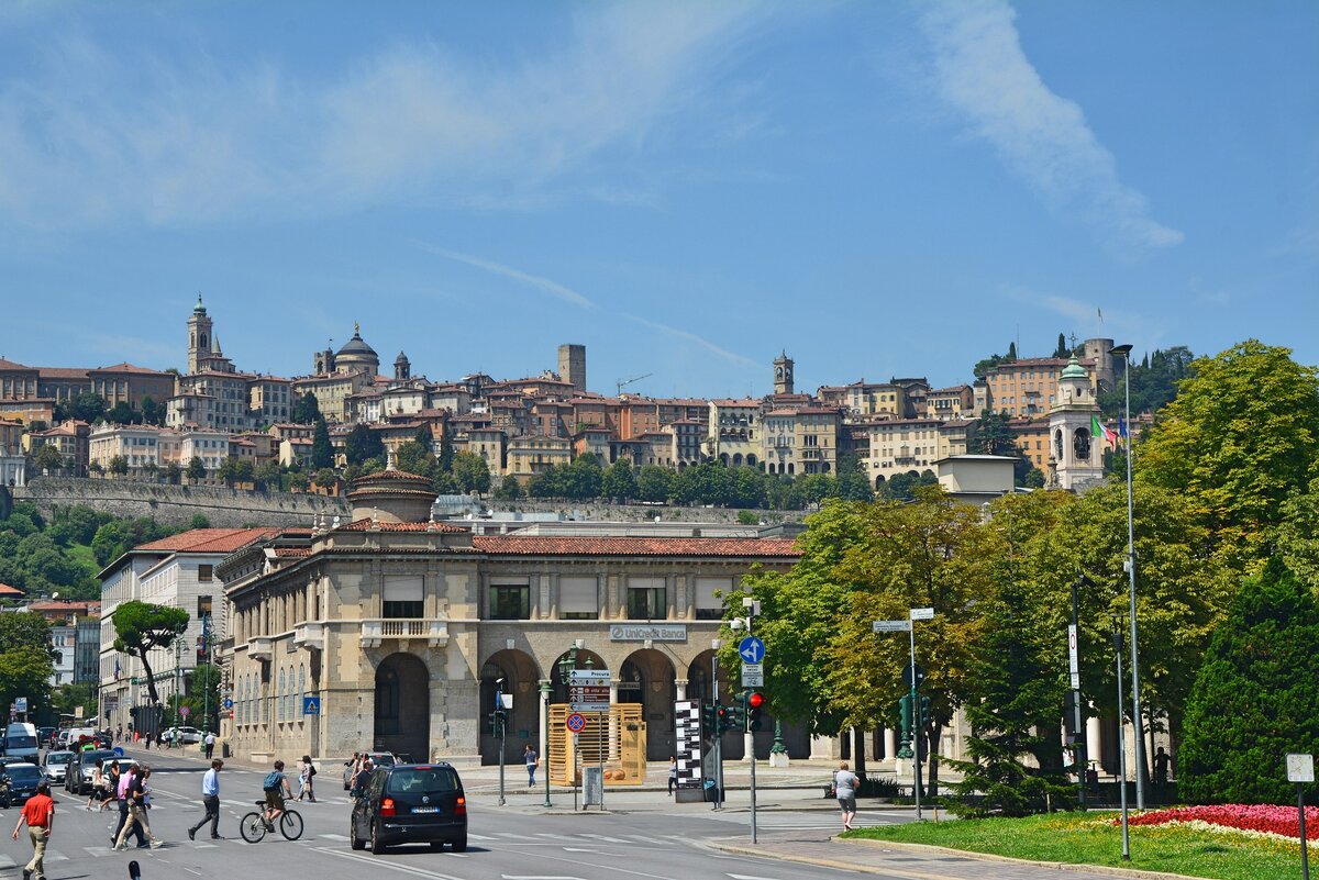 В Бергамо я прилетел из Порту, дабы продлить радость от прекрасного отпуска. Правда, вылет в 06:20 был очень неудобен во всех отношениях. Во-первых, на весь день обеспечено сонливое состояние, во-вторых, до аэропорта пришлось добираться на ночном такси, отдав 20 евро, что для меня было немного накладно. Однако все эти жертвы компенсируются целым не потраченным днём в красивом итальянском городке, который почему-то в аэропортах называют Миланом. Деталей перелета RyanAir я совсем не помню , так как уснул на откидном столике сразу после взлета, а разбудили меня, когда пролетали над озером Гарда, а после мы уже совершили посадку в аэропорту Орио-аль-Серио. До города добирался на автобусе 1А, что очень удобно, поскольку он идет через железнодорожный вокзал, который был для меня самым главным ориентиром по городу. И если детали перелета я помню слабо, то первое впечатление от Бергамо я запомнил надолго. Жара, запах мочи, облезлые здания и многочисленные гости из Африки, которые заполонил