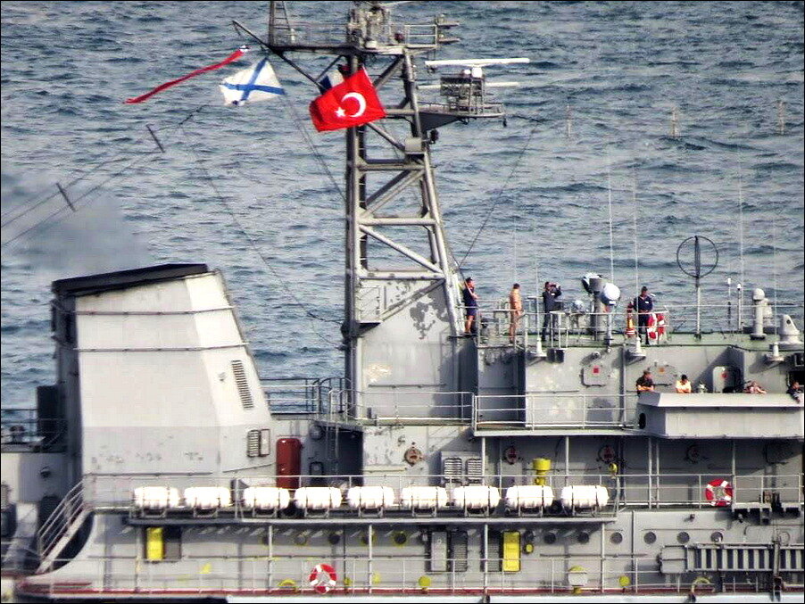 Вот фото проходящего Босфор нашего БДК. Видите красный вымпел над Андреевским флагом?