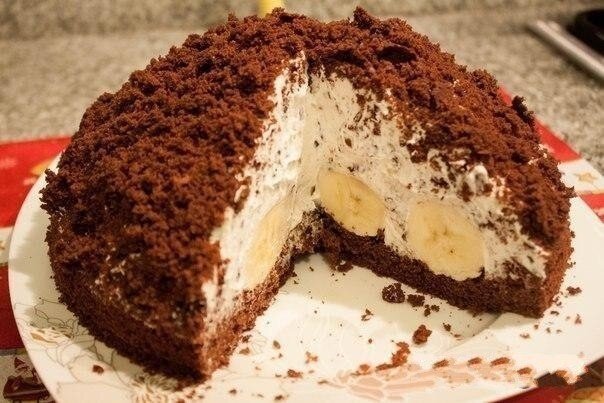 Смешать муку с разрыхлителем, сахаром,какао. Потом к муке добавить сгущенку, яйца, сметану. Все тщательно перемешать. Выпекать в смазанной форме, в духовке при температуре 180 градусов. Корж должен остыть. Потом надо выбрать середину. Бананы разрезать пополам вдоль и уложить плотно на корж. Взбить сливки с сахарной пудрой. Сливки выкладываем на бананы - так, чтобы получилась большая шапка из сливок. Сверху посыпать крошкой из той части коржа, которую вырезали. В принципе торт готов, НО лучше дать ему постоять пару часов.