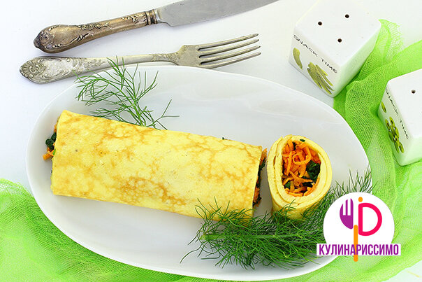 Приготовим яичный рулет со шпинатом, который можно подать к завтраку, обеду или ужину. Понадобятся только доступные ингредиенты, немного времени, и необыкновенно вкусная и полезная закуска не заставит долго ждать. Ингредиенты: Яйцо куриное – 3 шт. Молоко – 50 мл Соль – по вкусу Перец черный молотый – по вкусу Масло растительное – 3 ст.л. Шпинат – 150 г Морковь по-корейски – 50 г Масло сливочное – 15 г Способ приготовления Начнем с приготовления шпинатной начинки. Для этого понадобится свежие листочки шпината. Поместите их в дуршлаг и хорошенько промойте каждый листик. Обсушите бумажными салфетками от лишней влаги. Нарежьте тонкими полосками. В сковородку добавьте ломтик сливочного масла. Растопите его на умеренном огне. Переместите нарезанные листики шпината. Перемешайте. Тушите на умеренном огне 5-7 минут, периодически, помешивая. Приправьте измельченным черным перцем и солью. Для приготовления омлетного рулета, разбейте куриные яйца в глубокую миску. Возьмите ручной венчик ил