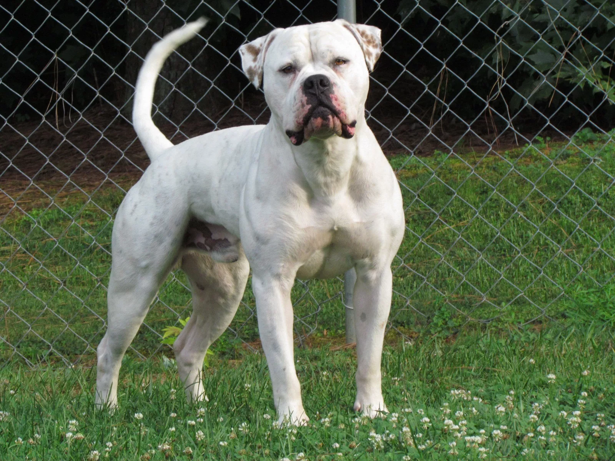 Американский бульдог. Эта собака запрещена в Дании в Сингапурии и в других мунициполитехов. Эта порода появилась на дальнем юге где собак разводили как фермерских бульдог. Он был натренерован ловить диких свиней у которых несколько сотен кг мяса и пара опасных бивней. Если их загнать в угол головы становятся опасными противниками что требует от собаки большой силы и атлетизма поэтому у бульдога высокий болевой порог. Собака весит 35-60 кг хотя может быть и больше.