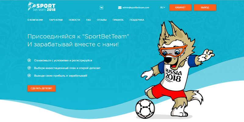 от KaccupMoney Инвестиционная компания Sport Bet Team Компания «SportBetTeam» осуществляет свою деятельность в сфере Доверительного управления в букмекерских конторах. Мы работаем для каждого, кто мечтает зарабатывать, но не разбирается во всех тонкостях букмекерского бизнеса. Компания «SportBetTeam» предоставляет услуги по доверительному управлению инвестициями клиентов в букмекерских конторах. Вы инвестируете, мы делаем ставки и выигрываем, вы – зарабатываете! Все просто! Нашим основным преимуществом является то, что мы работаем с собственными компьютерными программами. Три года назад наша опытная команда программистов создала уникальную систему, благодаря которой мы успешно делаем ставки. Эти программы автоматически анализируют и сравнивают события в сотнях букмекерских конторах. Кроме того, в дополнение к этому, в нашей команде задействованы профессиональные каперы – люди, занимающиеся аналитической деятельностью, делая ставки на спортивные события. Такое беспроигрышное объединение