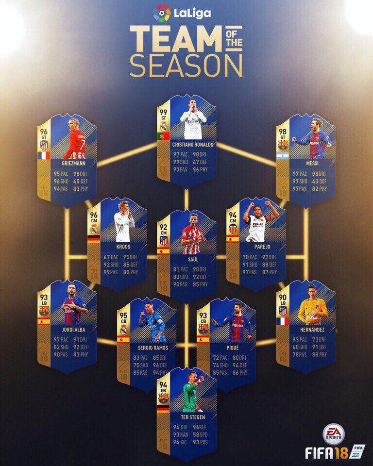 FIFA 18 представила символическую сборную Ла Лига сезона 2017/18. По 3 игрока представляют "Реал" и "Атлетико", 4 игрока из "Барселоны" и футболист "Валенсии" Парехо.