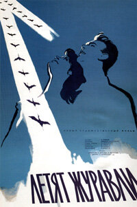 Фильмы о войне, которые получили главные фестивальные награды. Мы объединим фильмы не только по военной тематике, но и потому, что они получили признание на международном уровне. Они получили главные призы на международных фестивалях, и по мнению большинства критиков, и простых зрителей, эти фильмы являются шедеврами мирового кино. И, как всякое настоящее искусство, эти фильмы рассказывают о людях, и показывают высокий нравственный образ русского человека в тяжелейших и экстремальных ситуациях, которой и является война. И эти фильмы наполнены любовью к своим героям. Все фильмы объединяет еще и то, что сценарии написаны на основе великолепной литературной основе. Это пьеса Розова «Вечно живые», рассказы «Судьба человека» и «Иван», а также, повесть «Сотников». «Летят журавли». Пример фильма, который не сразу же поняли в родном Отечестве. Прокатная судьба его в год выхода в прокат была не плохой, но и не очень хорошей. По общей кассе он попал только на десятое место. Зато он завое