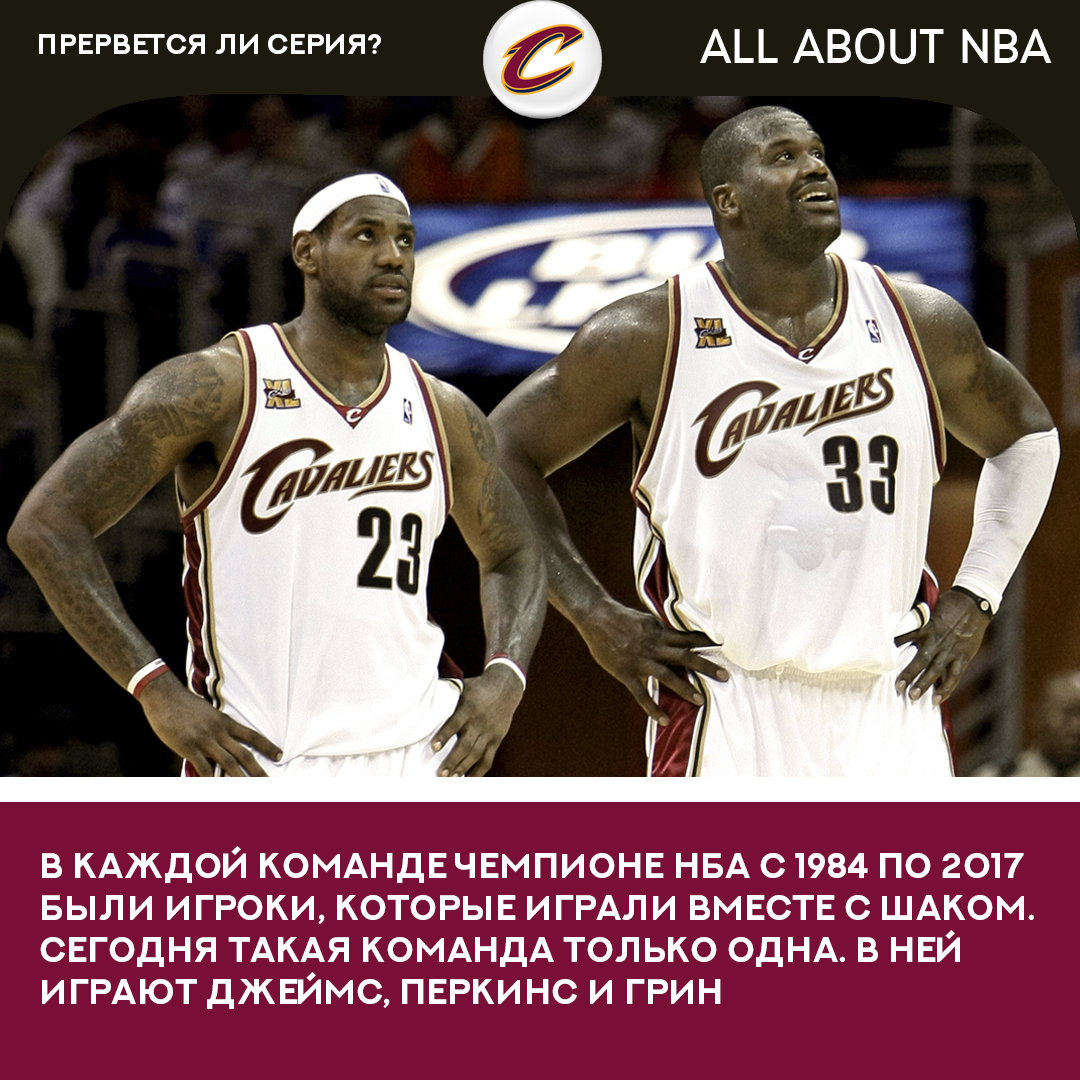 В каждой команде чемпионе нба с 1984 по 2017 были игроки, которые играли вместе с Шакилом. Сегодня такая команда только одна. В ней играют ЛеБрон Джеймс, Кендрик Перкинс и Джефф Грин Полный список команд и партнеров: 1984 (Celtics) — George Kite (Magic, 1994) 1985 (Lakers) — Byron Scott (Lakers, 1997) 1986 (Celtics) — George Kite (Magic, 1994) 1987 (Lakers) — A.C. Green (Lakers, 2000) 1988 (Lakers) — A.C. Green (Lakers, 2000) 1989 (Pistons) —Dennis Rodman (Lakers, 1999) 1990 (Pistons) — John Salley (Lakers, 2000) 1991 (Bulls) — Horace Grant (Lakers, 2004) 1992 (Bulls) — Horace Grant (Lakers, 2004) 1993 (Bulls) — Horace Grant (Lakers, 2004) 1994 (Rockets) — Robert Horry (Lakers, 2003) 1995 (Rockets) — Robert Horry (Lakers, 2003) 1996 (Bulls) — Steve Kerr (Magic, 1993) 1997 (Bulls) — Ron Harper (Lakers, 2001) 1998 (Bulls) — Ron Harper (Lakers, 2001) 1999 (Spurs) — Steve Kerr (Magic, 1993) 2000 (Lakers)* — Kobe Bryant (Lakers, 2004) 2001 (Lakers)* — Tyronn Lue (Lakers, 2001) 2002 (Laker