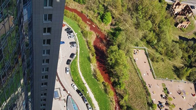 Река Мурзинка в Невском районе Санкт-Петербурга окрасилась в бордовый цвет, пишет «Фонтанка».