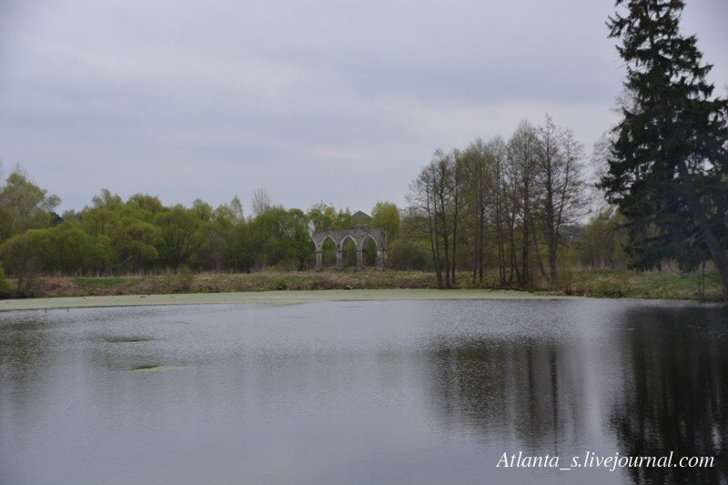 Добравшись до усадьбы, мы первым делом отправились к Барским прудам, где на противоположном берегу высятся развалины Музыкального павильона.