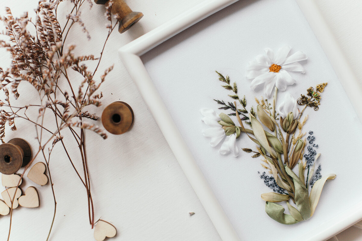 Вы - мамочка в декрете или бизнес-леди, а может, любимая бабушка? У вас точно получится вышить эту красоту! Нужно лишь немного материалов, хорошее настроение и желание создавать прекрасное вокруг себя ) Вот схема вышивки. Перенесите её на ткань и начинайте вышивать. Для работы понадобится: Лента белая 6 мм -2м Лента зеленая 6мм и 13мм - по 2м Нити зеленые, синие, желтые Ножницы, зажигалка, пяльцы Отличное настроение ) Для вышивки цветка нужен всего один шов, самый простой. Выведите иглу с лентой на лицевую сторону в центре цветка, отступите 1,5-2,5 см и уведите на изнанку. Стежки оставляйте свободными. Точно также вышейте боковую ромашку и бутон. Возьмите желтое мулине и заполните серединку цветка французскими узелками в 1-2 навива. Для стебельков используйте зеленую ленточку. Скрутите её в пальцах и пришейте к ткани. Голубые цветочки сделайте теми же свободными французскими узелками. Тонкие стебельки вышейте стебельчатым швом зеленой ниточкой. В завершение добавьте зелени: листья и