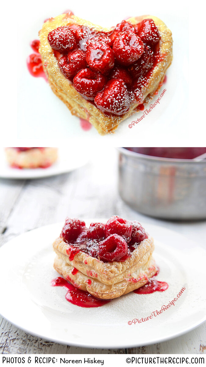 Ингредиенты 1 лист слоеного теста 1 чашка малины 100-150 г клубничного / простого сливочного сырка 250 г взбитого крема 1/2 Чашка сахара + 1 ст.л. для сливок 1 столовая ложка крахмала сахарная пудра для посыпки приготовление - Разверните и раскройте слоеное тесто. - Используя резак для печенья вырезать 4 больших сердца. - Затем, используя меньший сердечный резец, сделайте отметку внутри большего сердца, вырезанного. Не разрезайте его до конца, просто сделать отметку. - Поместите слоеные пирожные сердца на лист для запекания, застеленный пергаментной бумагой. И запекать в течение 10-12 минут до золотистого и хрустящего состояния - Тем временем растворите сахар в 2-3 столовых ложках воды и доведите до кипения. - Бросьте в 5 или 6 малинин и раздавите их, чтобы они окрашивали и придавали аромат сиропу. - Когда сироп начинает кипеть и слегка сгущается, добавьте столовую ложку крахмала, растворенного в небольшом количестве воды, тщательно перемешайте варить 5 мин - Когда си