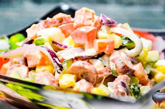 Привет, друзья! Сегодня я предлагаю вкуснейший салат для любого праздника, в том числе и Дня Рождения. Это очень легкий и простой салат и неимоверно вкусный и сытный. Ингредиенты: Копченая колбаса - 280 гр. Свежие огурцы- 190 гр. Болгарский красный перец - 180 г Консервированная кукуруза - 250 г Лук репчатый синий - 45 гр. Вареные яйца - 2-3 штуки Горчица - 30 грамм Майонез - 145 грамм Соль - 5 гр. Перец черный молотый Специи по вкусу Приготовление: Нарежьте копченную колбасу (280 гр.) небольшими кубиками. Колбасу использовать можно любую. Добавляем к колбасе болгарский перец (180 гр.), нарезанный кубиками. Огурцы свежие (190 гр) нарежьте кубиками и добавьте к перцу сладкому и колбасе. Лук (45 гр.) нарезаем полукольцами и также добавляем в наш салат. Добавить яйца (3 шт.), нарезанные кубиками. Все ингредиенты для салата хорошо перемешать в миске. Добавляем кукурузу и предварительно смешанный майонез с горчицей с солью и специями. Всё тщательно перемеш