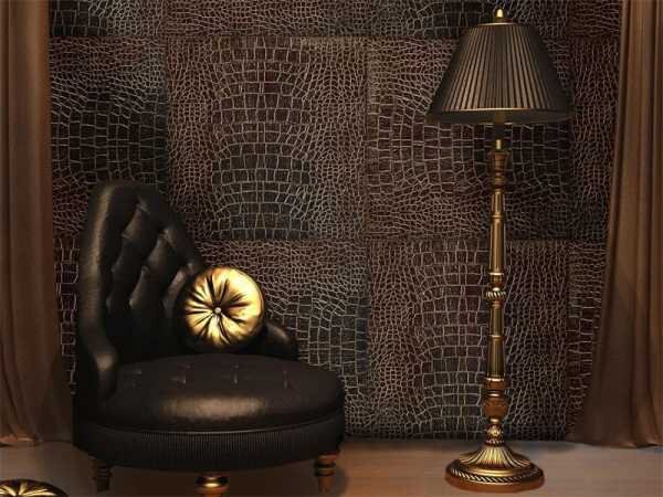 - Имитация крокодиловой кожи — интересное решение для тех, кто предпочитает британский, колониальный стиль в оформлении интерьеров. Брутальность, чопорность, лаконичность и строгость — его основные черты, которые эффектно «поддерживает» отделочный материал с текстурой кожи крокодила. К самым распространенным цветам таких обоев относят серебристый, золотой, черный, синий и бордовый.