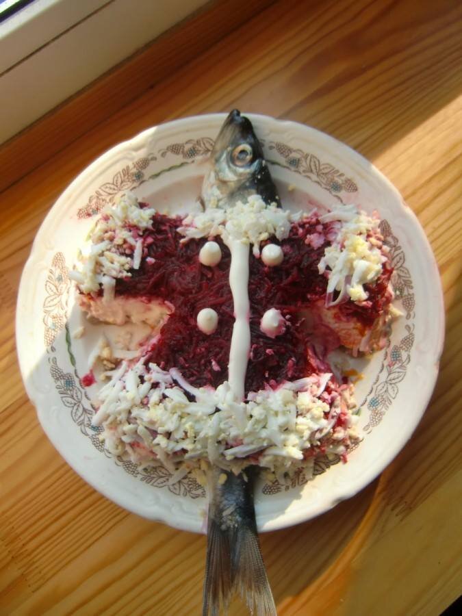 Блюдо селедка под шубой люблю делать не только на новый год. Часто делаю и просто так без повода праздника. Обычное её оформление как то приелось. И я сделала её в таком исполнении. Ещё делала рулетом, тоже выглядит красиво. Не знаю как люди покупают салаты в кулинарии и не боятся отравится. Ведь зачастую они лежат там весь день, что в принципе не должно быть. Как готовится салат : Всё овощи картошка, морковка, свекла варится в мундире. Очищаю и натираю на средней терке. Не забудьте варенным яйцом обрамить каемочку на шубке нашей селедки. Конечно по порции её получается очень мало, но согласитесь как красиво. Приятного аппетита и готовьте не только вкусные блюда, но и красивые.