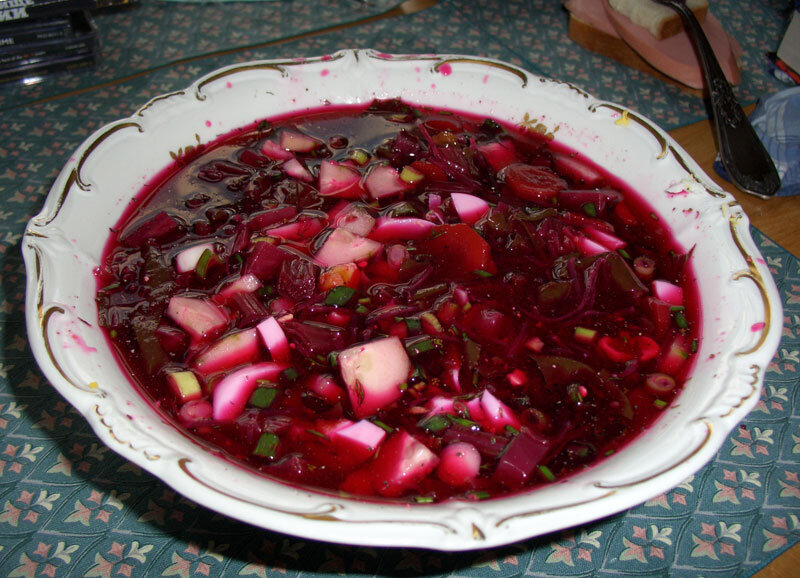 Свеклу предварительно почистить, положить в кастрюлю и поставить варить. Когда свёкла сварится нужно ее достать и охладить в холодной воде. В этот отвар нужно положить картофель нарезанный кубиками. Мелко порезанный лук пожарить на сковороде и добавить в кастрюлю вместе с чесноком. Добавьте так же натёртую на крупной тёрке морковку. Жарьте ее 3 минуты и добавьте в кастрюлю. Свеклу нареж