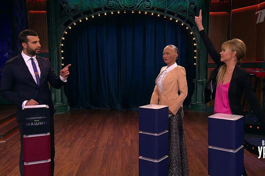 Тема искусственного разума, еще недавно бывшая вотчиной исключительно ученых, фантастов и гиков, постепенно захватывает широкие массы телезрителей. Уникальный эксперимент был проведен в передаче «Вечерний Ургант: Человечество против машин» от 20.10 2017 – робот София вступила в поединок с живым человеком. Знаменитый андроид показал многомиллионной аудитории Первого Канала, как далеко продвинулись современные технологии. Хотя робот София в гостях у Урганта присутствовала впервые, она уже известна по многочисленным интернет-роликам, демонстрирующим ее умение взаимодействовать с людьми. Создатели также поработали над ее способностью воспроизводить мимику – улыбаться, выражать удивление, задумчивость и другие эмоции. Стоит заметить, что это первый в мире робот, наделенный гражданством – в 2017 году она стала подданной Саудовской Аравии. Выпуск «Человечество против машин» Иван Ургант и София начали со знакомства, наполненного фирменными шутками ведущего и не менее остроумными ответами е
