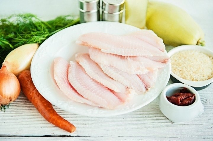 Из чего будем готовить: Рыбное филе. Кабачки. Рис. Лук репчатый. Томатная паста. Морковь. Тимьян (сушеный). Зелень. Соль. Перец. Масло подсолнечное. Начинаем: Варим рис. Измельчить филе рыбы с помощью блендера или мясорубки. Рыбу соединяем с отварным рисом, добавляем мелко нарезанные укроп и петрушку, а также кабачок, натертый на крупной терке. Все это перемешиваем, добавляем соль и перец по вкусу. Формируем небольшие тефтели. Далее нужно смазать растительным маслом глубокую сковороду или форму и выложить в нее тефтели. Готовить в разогретой до 180 °С духовке в течение 20 минут. Натереть морковь на крупной терке. Нарезать полукольцами лук. Все вместе обжарить на растительном масле. Добавить томатную пасту, соль, перец, щепотку тимьяна и воду. Тушить в течение 5 минут. Выложить овощи в форму с тефтелями. Добавить воду – она должна покрывать тефтели. Повторно поставить блюдо в духовку и тушить еще 20 минут при 180 °С. ГОТОВО. ПРИЯТНОГО АППЕТИТА.