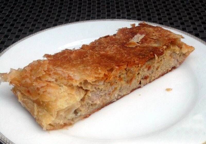 Ингредиенты: Тесто слоеное - 300 г Фарш мясной - 400 г Яйца - 1 шт. Хлеб белый - 100 г Лук - 2 шт. Чеснок - 1 зубок Масло растительное - 2 ст. ложки Горчица - 1 ст. ложка Соль - 1 ч. ложка Сода - 1 ч. ложка Перец черный молотый - 0,5 ч. ложки Чабер - 0,25 ч. ложки Приготовление: Булочку или черствый белый хлеб нарезать без корок на кубики. Размочить в холодной воде (залить водой на 10-15 минут). Лук очистить и мелко нарезать. Чеснок очистить, мелко нарезать и смешать с луком. На сковороде разогреть масло. Репчатый лук и чеснок тушить в масле на среднем огне 5-7 минут. Хлеб отжать. Мясной фарш смешать с булкой, луком, чесноком. Перемешать. Затем фарш смешать с яйцом, горчицей и специями. Разложить пленку. Фарш сформировать полосой на пленке. Отдельно постелить пленку или пергаментную бумагу. Раскатать тесто до толщины 3 мм Выложить фарш так, чтобы позже можно было мясо уложить в «конверт» из раскатанно