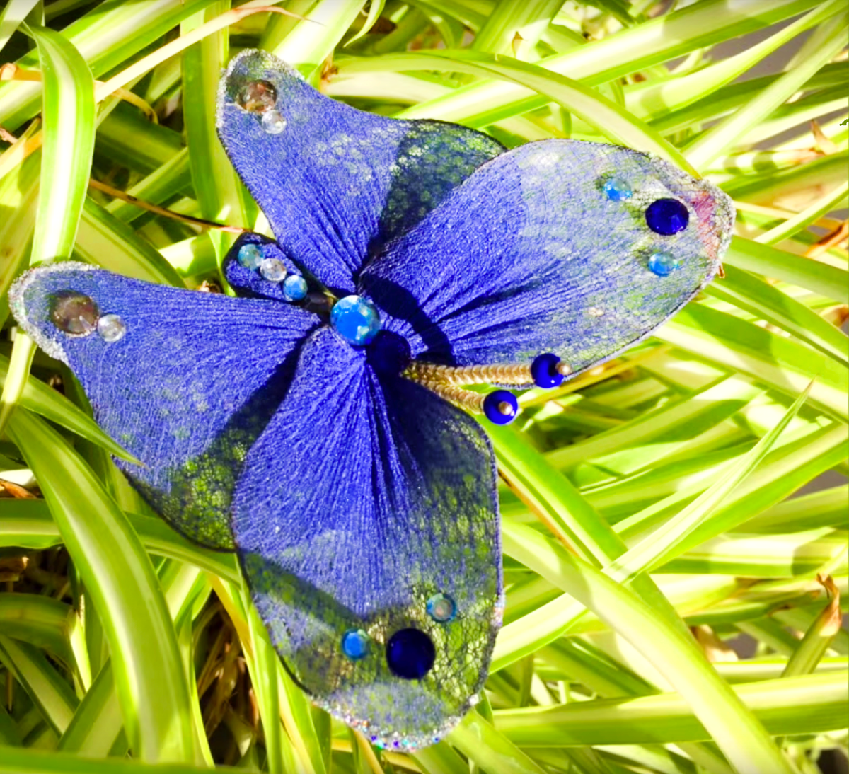 Из далека она как живая. Кажется, что сейчас взмахнет крыльями и полетит. Такая бабочка будет красиво смотреться и на комнатном цветке и в вашем саду. А еще ее можно прикрепить на заколку или брошь. Нам понадобится: Возьмите круглую формочку или бутылку, обмотайте вокруг нее проволоку и закрутите концы. Получится вот такая заготовка. Нам их понадобится 4. Натянем на нее капрон, завяжем его ниткой и отрежем все лишнее. Вот что получилось, делаем это с всеми заготовками. Возьмем 2 булавки, с шариками на концах, если у вас нет таких, возьмите проволоку и сделайте небольшую петельку на конце. Нанижем сначала бусинку а после наберем бисер на каждую из них и скрутим их между собой. Свяжем крылья между собой у основания. Так же к основанию привяжем усики. Скрутим хвостики вместе и замотаем их капроном. Свяжем кусочком капрона. Расправим крылья бабочки Предадим крыльям более реалистичную форму Наша бабочка уже похожа на настоящую. Украсим ее стразами и блестками, прикрепив их клеем. Вот так