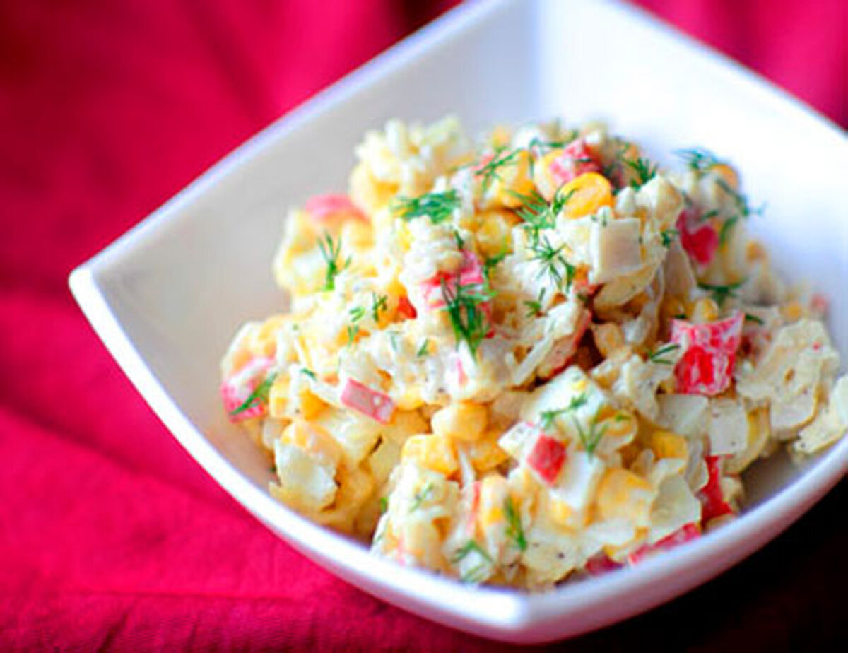 Не знаете, что приготовить на семейный ужин? Самый простой вариант — салат из крабового мяса и сытно, и вкусно. Время на его приготовление уходит примерно полчаса, может и меньше. Ингредиенты: Несладкий йогурт: 100 мл; Свежий огурец: 2 шт.; Салатный лук: 2 шт.; Перец болгарский: 2 шт.; Стеблевой сельдерей: 5 шт.; Лимон: 1 шт.; Столовый 9% уксус: 5 чайных ложек; Мясо краба: 650 грамм. Количество ингредиентов было рассчитано на 5 порций. Но их можно увеличить или уменьшить, в зависимости от того, сколько нужно накормить человек. Подготовка продуктов: 1. Начать следует с приготовления крабов. Их нужно отварить вместе с панцирем, согласно инструкции на упаковке. После того как мясо сварите, остудите и порежьте соломкой. Потом ее заправьте столовым уксусом и лимонным соком (выдавить из цитруса); 2. Измельчить стеблевой сельдерей. 3. Перец болгарский нарезать в форме кубиков. 4. Лук — мелкими полукольцами. 5. Огурец — соломкой. Предварительно, его очистив от кожуры. Приготовление салата: 1