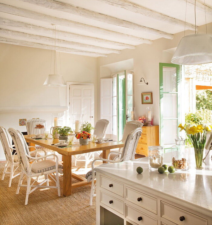 Современная кухонная мебель никак не спорит со старыми балками и очень вписывается в этот деревенский интерьер. Дизайнеры удачно вписали эту деревенскую пастораль холодильный агрегат и современные светильники. Всё строго на своих местах и не портит общей картины. Окна в пол, оформлены ставнями. Ставни укрыться от жаркого солнца Средиземноморья и скрывают от посторонних взглядов. Зона у очага выложена узорчатой плиткой. Той же плиткой оформлен и подоконник возле маленького оконца, что и играет роль фартука возле «мокрой»зоны. Плетёные абажуры, короба, корзины и циновки добавляют деревенского колорита. Пол выполнен из плитки, терракотового цвета и укрыт циновками из джута. Лёгкий современный стеллаж, с застеклёнными дверцами, заполнен
