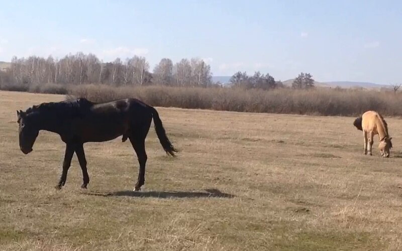 На видео вы видите молодого вороного жеребца иноходца. В его небольшом косяке пока только семь кобылиц. Но хозяин надеется довести их число до тридцати-сорока, как обычно и бывает в косяках. Ожидается, что от жеребца-иноходца родятся жеребята-иноходцы.
