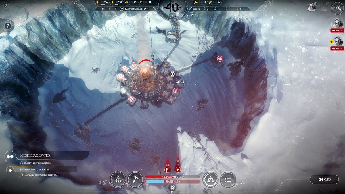 Заставьте людей работать 24 часа в сутки для того, чтобы спасти жизни, и они отплатят вам повышением «Недовольства». Отправьте всех спать с полными животами и «Надежда» увеличится, даже если они будут спать в ледяных палатках. Если «Недовольства» станет слишком много или «Надежда» уменьшится до критического уровня, вам дадут несколько дней на исправление ситуации, иначе наказанием станет изгнание из поселения и проигрыш.