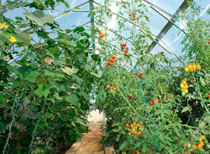 Теплицу делят на две половины, в одной высаживают огурцы, в другой помидоры. В каждой части создают необходимый для этой культуры микроклимат.