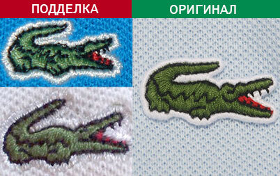 На оригинальной одежде крокодил нашивается поверх ткани при помощи ниток и лески. У подделок логотип вшивается внутрь ткни, он как бы утоплен.