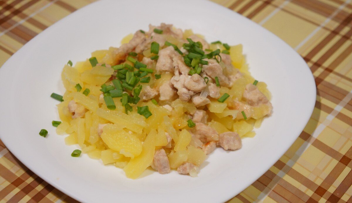 1 Картошку почистим и режем соломкой. Куриное филе режем на маленькие кубики. Режем лук.