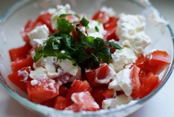 Для начала накрошим зелень. Перчик порезать мелкими частями. Помидорчики нарезать дольками. Маслины порезать на круглые диски. Далее все нужно смешать с творогом и добавить соль на ваш вкус.