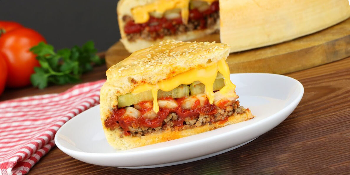 Сегодня хочу предложить вам приготовить Закусочный пирог – чизбургер. Вы, наверное, неоднократно пробовали это блюдо в Фастфудах и знаете, что домашняя еда на много полезней и в вкуснее. А самое главное Чизбургер готовится из доступных продуктов и прост в приготовлении. Очень сытный и вкусный! Начнем.. Необходимые продукты: Тесто: • Мука -400 гр; • Вода -250 гр; • Масло растительное — 3 ст, л; • Яйцо — 1 шт; • Соль — 2 ч.л; • Дрожжи — 20 гр; • Сахар — 1 ч.л; Начинка: • Фарш (говяжий) -400 гр; • Лук — 1 шт; • Томатный соус — 150гр; • Маринованный огурец — 3 шт; • Сыр -150 гр; • Кунжут • Перец Приготовление: Тесто: 1. Растворите дрожжи в теплой воде и дать настоятся опаре минут 20; 2. К опаре добавить яйцо, растительное масло, соль и сахар, перемешать; 3. Всыпьте муку и замесите мягкое тесто; 4. Накрыть тесто полотенцем и дать постоять полтора часа; Начинка: 1. Пережарьте фарш на разогретой сковороде с растительным маслом, в конце посолить и поперчить; 2. Нарезать лук полукольцами и обд
