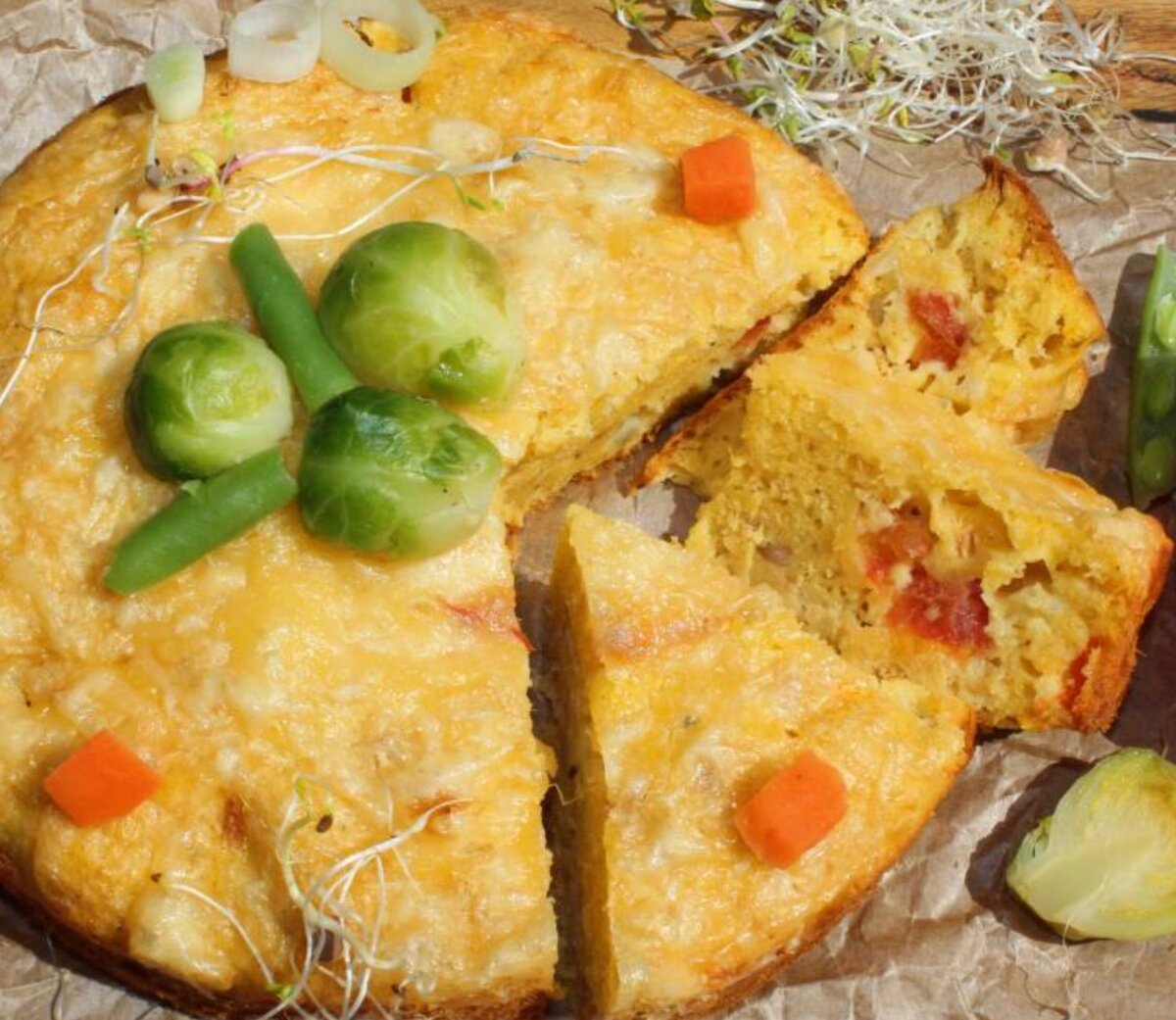 Этот пирог может очень пригодится, если нужно взять с собой перекус в дорогу! Нам понадобится: Мука пшеничная - 100 г Масло растительное - 50 мл Яйца - 2 шт Разрыхлитель - 1 ч л Ветчина - 120 г Сыр - 80 г Помидор большой - 1 шт Соль и перец - по вкусу Начинаем готовить: Взбейте яйца до пышной пены. Просейте муку и разрыхлитель. Натрите сыр на тёрке. Ветчину нарежьте полосочками или кубиками. Нарежьте помидор небольшими кусочками. Смешайте муку и разрыхлитель с взбитыми яйцами. Затем добавьте 2/3 сыра, ветчину и помидоры. Посолите и поперчите по вкусу. Аккуратно перемешайте ложкой. Смажьте форму для выпечки маслом и слегка припудрите мукой. Вылейте тесто в форму. Посыпьте верх пирога оставшейся 1/3 сыра. Выпекайте в предварительно разогретой до 180 градусов духовке примерно 40-50 минут, до сухой палочки. Приятного аппетита!