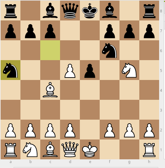 1. e4 e5 2. Nf3 Nc6 3. Bc4 Nf6 4. Ng5 d5 5. exd5 Na5!?