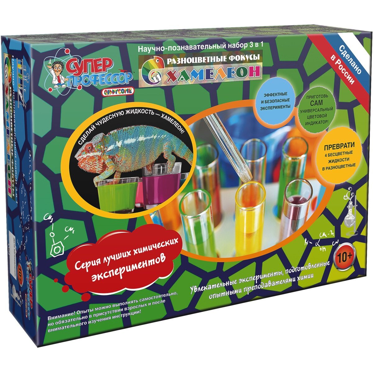 В природе существуют удивительные вещества, которые называются индикаторами. В растворе эти вещества меняют свой цвет в зависимости от показателя кислотности среды. Набор "Разноцветные фокусы Хамелеон" содержит один из таких универсальных индикаторов, а также вещества, от которых он окрашивается в различные цвета. Вместе с простыми и красивыми экспериментами в описании предельно просто , но строго научно дано понятие показателя pH кислотности среды. Научно-познавательный набор 3 в 1 "Разноцветные фокусы Хамелеон" также позволяет провести химическую реакцию под названием Хамелеон". Жидкость на глазах меняет цвет с темно лилового в фиолетовый, зеленый, желтый и, затем, желтовато-бурый цвет. На основе этой демонстрации, которая проста и наглядна сама по себе, в брошюре популярно изложен механизм изменения цвета раствора в ионно-обменных химических реакциях. В заключении брошюры дан рецепт приготовления собственного цветного индикатора для фокусов из краснокочанной капусты. Да, да, именно