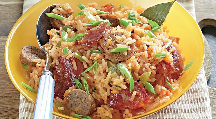 Ингредиенты: Начнем приготовление! 1. Режим: лук полукольцами, болгарский перец небольшими квадратами, куриное филе небольшими кусочками, колбаски - кружками шириною в 2 сантиметра и очень мелко чеснок(можно пропустить через пресс). Разогреваем сковороду и жарим в масле филе, в течении 5-7 минут. Отправляем к филе копченые колбаски. Перемешав, оставляем жариться еще 3 минуты. 2. Добавляем к мясу лук, перец, чеснок и специи : соль, кайенский перец, черный перец. Перемешиваем и оставляем готовиться на 4-5 минут. 3. Промыв под холодной водой, добавляем рис. Равномерно распределите рис по всей сковороде. Готовим буквально пару минут. 4. Заливаем всю смесь водой или куриным бульоном(так вкуснее). Добавляем лавровый лист и тщательно перемешиваем. Пробуем немного на вкус, и по необходимости добавляем соли или остроты (кайенский перец). Доводим до кипения, убираем огонь на небольшой и, накрыв сковороду крышкой, оставляем готовится в течении 20 минут. Когда все будет готово снимаем с огня и