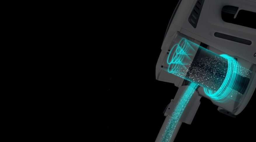 Мотор и аккумулятор находятся в небольшом корпусе с ручкой. Там же расположен и контейнер для сборки мусора с циклонным фильтром. Ёмкости аккумулятора хватает на 30 минут автономной работы или 120 квадратных метров убираемого помещения.