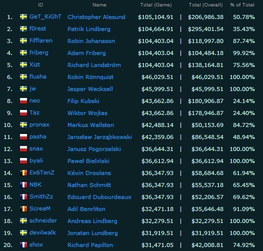 Самым богатым киберспортсменом мира второй год подряд остается Саахил « universeU» Арора. За несколько лет игровой карьеры офлейнер evilEvil genuis Eвыиграл в Dota 2 около $2,7 млн. Самым богатым среди европейцев стал Клемент «Puppey» Иванов. Значительный прорыв в финансовом рейтинге эстонец совершил после победы на The Shanghai Major 2016 в составе Team Secret. Первые 32 строчки рейтинга занимают игроки Dota 2. Лишь на 33 и 34 позиции расположились трёхкратные чемпионы мира по League of Legends — Ли «Faker» Сан Хёк и Бэ «bengi» Сон Юн. Прошедший The International 2016определил нового лидера среди представителей СНГ — им стал украинец Роман «Resolut1on» Фоминок, заработавший около $685 тыс. за второе место на чемпионате мира в Сиэтле. На позиции лидера Фоминок сместил своего земляка — Данила «Dendi» Ишутина. Среди русских игроков самым богатым второй год остается Сергей «God» Брагин — 108 строчка и $393 тыс. Самыми успешными «стрелками» стали Филип «NEO» Кубски и Виктор «TaZ» Войтас, к