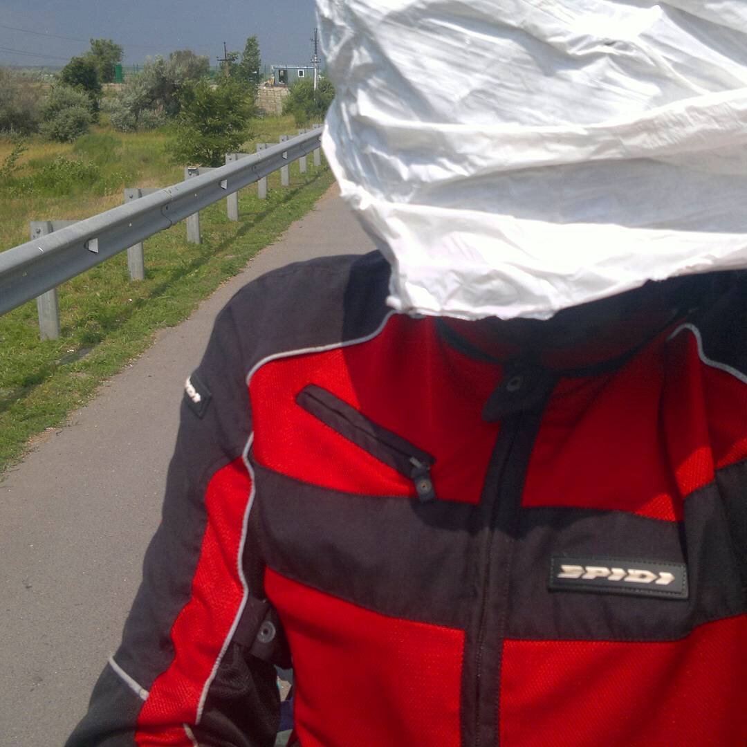 С утра поднялся штормовой ветер, а откладывать поездку никак - себя не уважать. За городом только успел набрать 110 как с обочины порывом ветра вынесло здоровенную клеенку и прямо мне на голову, отклониться не успел, да и шансов не было, большая. Клеенку с головы не снять на ходу, руки руль удерживают, который колбасит порывами ветра. Признаюсь, струхнул не слабо - ничего не вижу, мимо машины проносятся...Включил аварийку, плавненько и прямолинейно оттормозился на ощупь, чтобы траекторию движения не менять и под машины не попасть. Чуть сместился вслепую по памяти к обочине, так и остановился с этой штукой на голове. Только успел себя на память сфоткать, как на втором кадре клеенку сорвало с головы и унесло дальше через дорогу, даже снимать с себя не пришлось. И дальше всю поездку в пути пришлось бороться с ветром и другими невзгодами. Несколько аварийных ситуаций за день. Вообщем, дорога не легкая получилась и опасная.