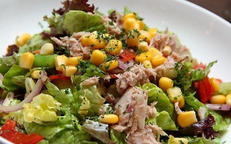 Такой салатик очень вкусный и легки. Очень прост в приготовлении! Абсолютно ничего варить не нужно, все порезал и смешал в тарелке. Калорийность мала, можно кушать хоть днем, хоть вечером. Обязательно попробуйте, Вам понравится! Для приготовления этого салата, Вам понадобится: половина банки консервированной кукурузы 1 банка консервированного тунца в собственном соку листья салата или смесь зелени и пекинская капуста 1 головка репчатого лука половина болгарского перца оливковое масло для заправки соль перец специи по вкусу Способ приготовления: 1. Берем глубокую салатницу, засыпаем в нее консервированную кукурузу 2. Открываем банку тунца, сливаем рассол и нарезаем тунец или разбираем руками 3. Моем и режим брусочками болгарский перец 4. Делаем маринад для лука: в кипяченую теплую воду, кладем соль и заменитесь сахара по вкусу, добавляем немного уксуса. Все пропорции по вашему вкусу. 5. Очищаем лук от кожуры и кладем его в маринад на 10 минут 6. Моем листья салата, зелень и пекинскую