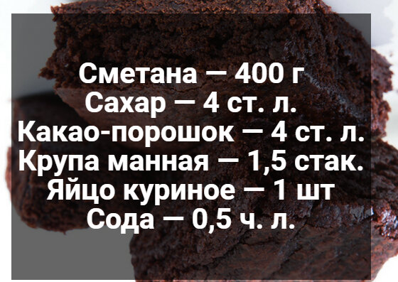 Мы создали сайт Вконтакте и в Одноклассниках, все самое новое Вы найдете там, присоединяйтесь!!!! Продукты: Приготовим: 1. В миске соединим сахара, сметаны и соды, перемешаем. 2. Разбиваем яйцо, насыплем манку. 3. Добавим теперь какао и перемешаем. 4. В форму выльем получившееся тесто и поставим в духовку. Выпекаем при 190*С на 40 минут. Кушайте на Здоровье!!!! Подписывайтесь и Вы найдете много интересного и самых простых рецептов на Нашем канале!!!