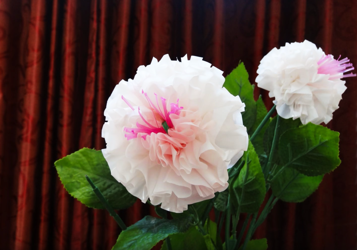 Когда мы делаем цветы в домашних условиях, это всегда поднимает настроение. Если вы хотите положительных эмоций от рукоделия, выбирайте цветы. Сделать такой пушистый букет просто элементарно. Нам понадобятся: Возьмите белый пакет и разверните его на столе. Отрежьте 2 полосы. И разрежьте их пополам. У нас получились 4 длинных пластиковых ленты. Отрежьте трубочку по длине равную ширине полосок. Согните ее пополам Нарежьте тоненькими полосочками с двух сторон, не прорезая середины. Подплавьте края над свечей или зажигалкой. Вот что должно получится, это будут наши пестики. Положите полоски друг на друга и соберите их гармошкой. сожмите в центре. Сюда же прислоним пестики. Перевяжем зеленой проволокой. Развернем гармошку Расправим каждый слой по отдельности. Вот такая красота у нас получилась. Чтобы цветок выглядел более аккуратно, обрежьте лишнее. Придайте цветку шарообразную форму. Будьте осторожны, не срежьте пестики. Наши цветы готовы, сделайте несколько цветов и прикрепите их на
