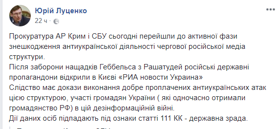 Генпрокурор Луценко признал Крым российским Страна окончательно превращается в филиал сумасшедшего дома. Несколько часов назад генеральный прокурор через ФБ поведал миру о том, что некие россияне «відкрили в Києві «РИА новости Украина», а некие украинцы совершили «державну зраду», когда, находясь в 2014 году в Крыму, готовили материалы, оправдывающие аннексию… Предлагаем, тем кто ещё не ..., подписаться на наш журнал "СтёбNewS"©, давайте досмотрим это представление театра абсурда вместе)