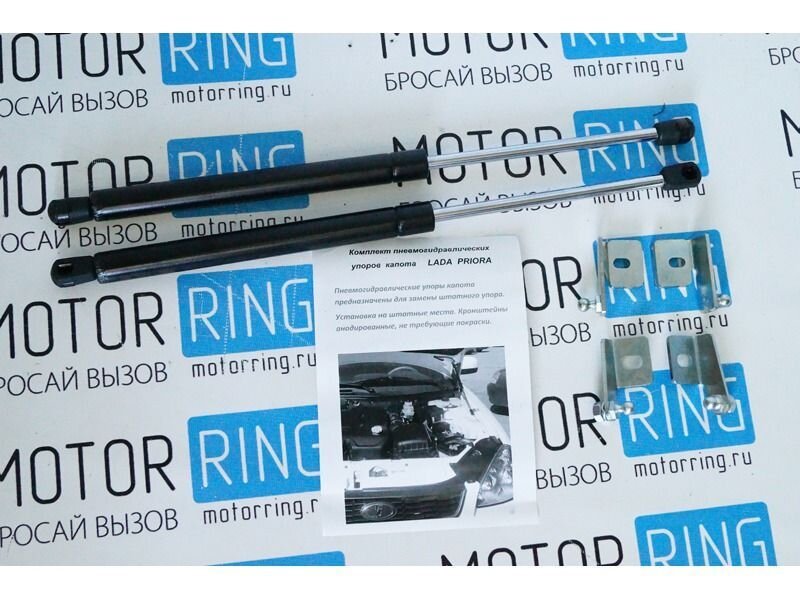 В этот раз решил заказать комплект пневмо-гидравлических упоров капота для Лада Приора, поскольку уже надоело каждый раз доставать штатный упор и переживать, что упор вовсе свалится и капот упадет. Заказ пришел довольно быстро (за 7 дней дошел из Тольятти до Краснодара). Заказывал Почтой России. Все упаковано качественно и добротно. Распаковав товар, решил приступить к установке. В комплекте шли: 2 верхних крепления; 2 нижних крепления; 2 пневмогидравлических упора; подробная инструкция по установке с фотографиями. Упоры довольно жесткие, но с усилием их можно сжать и руками. Для установки понадобятся: вороток; головка на 8; головка на 13; 2 рожковых ключа на 12 и 13. Для начала головой на 8 откручиваем болты крепления крыла (с каждой стороны по одному). Устанавливаем нижние крепления. Они немного толще в основании, чем верхние. Далее на петлях капота откручиваем верхние болты крепления (с каждой стороны по одной гайке) головой на 13 (с водительской стороны необходимо снять пластмасс
