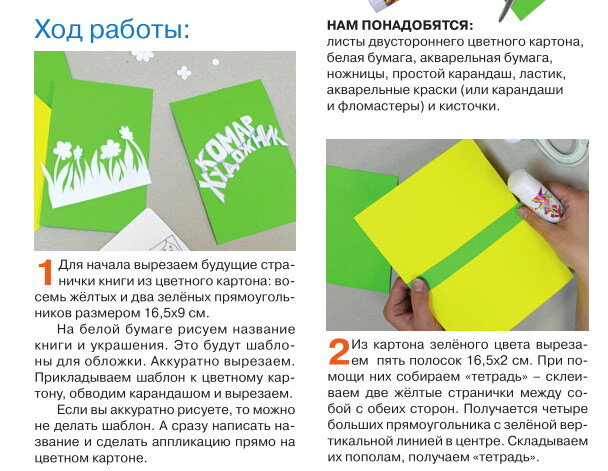 Для начала вырезаем будущие странички книги из цветного картона: восемь жёлтых и два зелёных прямоугольников размером 16,5х9 см. На белой бумаге рисуем название книги и украшения. Это будут шаблоны для обложки. Аккуратно вырезаем. Прикладываем шаблон к цветному картону, обводим карандашом и вырезаем. Если вы аккуратно рисуете, то можно не делать шаблон. А сразу написать