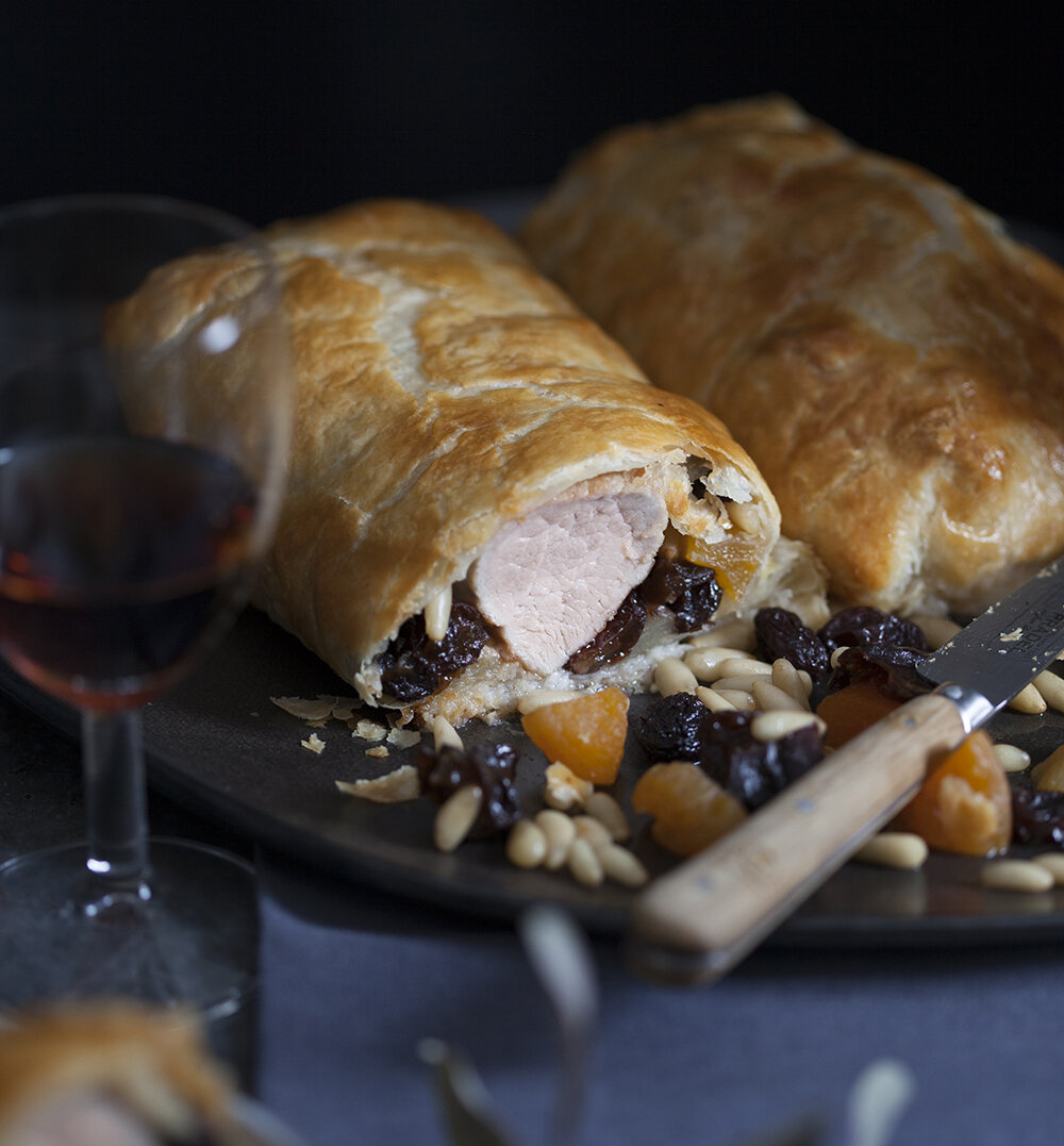 Свиная вырезка в слоеном тесте с черносливом, абрикосами, изюмом и кедровыми орехами. Звучит очень неплохо, особенно если эти сухофрукты и орехи готовятся в десертном вине. По-настоящему праздничное блюдо! Приготовьте и удивите гостей и родных! Мясо равномерно пропекается, но внутри остается сочным, благодаря румяной «мучной обертке». Классическое английское блюдо и его упрощенные вариации не требуют сложных кулинарных техник, а с ингредиентами и количеством начинки можно смело экспериментировать. Рецепт предназначен для 4 человек: 2 свиные вырезки готовое слоеное тесто 1 яйцо 50 г изюма 50 г чернослива, разрезанного на кусочки 50 г сушеных абрикосов, разрезанных на кусочки 50 г кедровых орехов 200 мл десертного вина соль и перец оливковое масло Обжариваем филе свинины в оливковом масле до золотистого цвета со всех сторон. Вынимаем из сковороды, посыпаем солью, перцем и остужаем. В кастрюлю помещаем изюм, чернослив, абрикосы и кедровые орехи и в течение 5 минут тушим в десертном