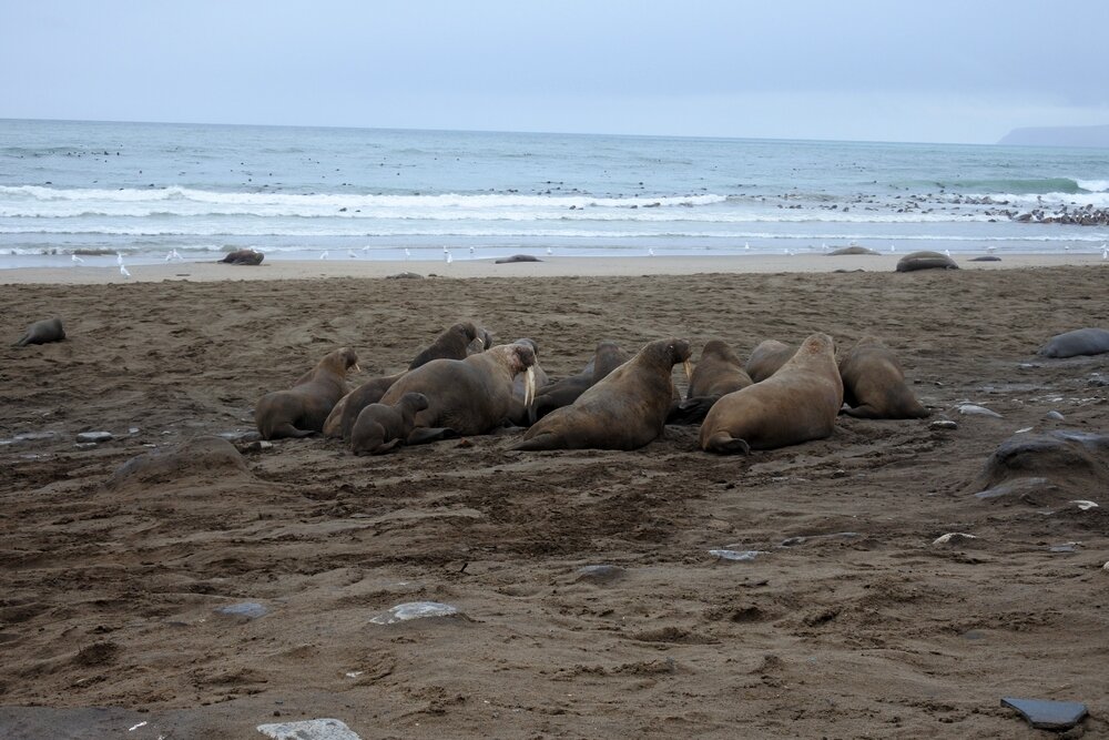 Не все моржи ушли в море. Кто то так и остался на лежбище. Издалека некоторые из трупов выглядят как живые